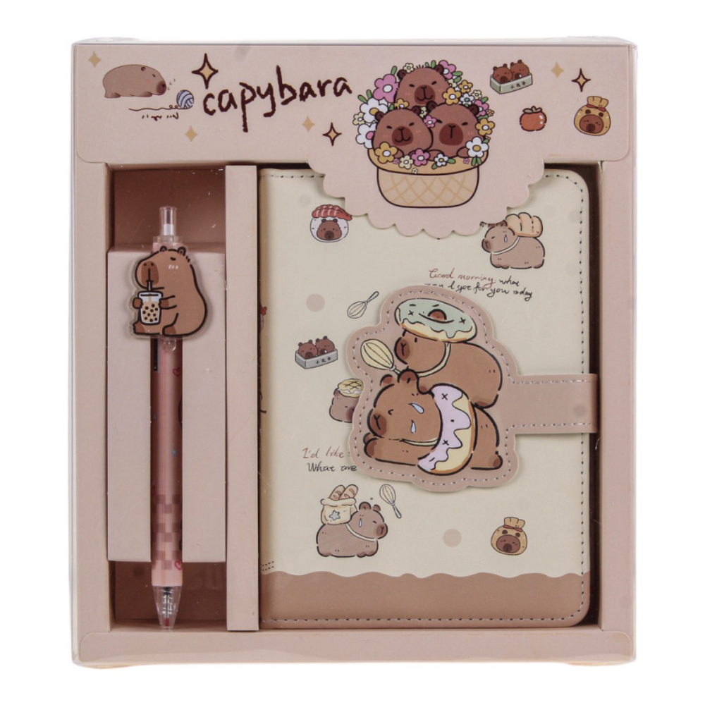 Набор Блокнот на кнопке 10,3*8см.,авторучка 8цв.мини-текстмаркер,скотч "Капибара" блист,асс. (Basir)