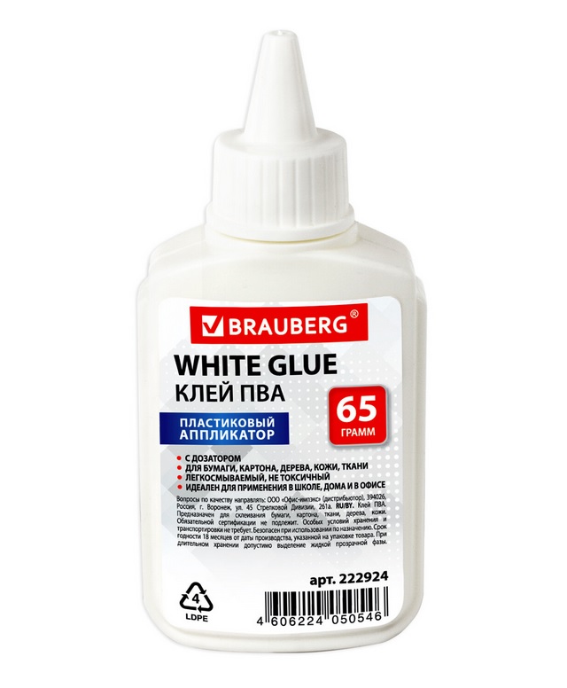 Клей ПВА BRAUBERG предназначен для склеивания бумаги, картона, фотографий, дерева и кожи.Имеет объем 65 мл. Пластиковый дозатор обеспечивает точное и равномерное нанесение. Обладает устойчивостью к морозу, не токсичен. Наносится тонким слоем, обеспечивая быстрое схватывание поверхностей, а также экономичное расходование. Съемный колпачок предохраняет клей от засыхания. Необходимо взболтать перед применением.